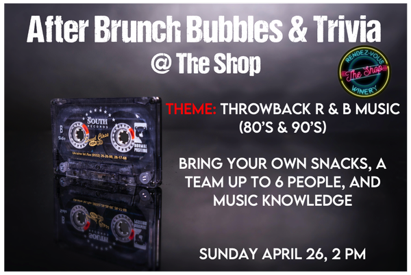 gather a group of your smartest friends and test your knowledge (the theme is r&B throwbacks) at the Shop by rendez-vous AFTER BRUNCH BUBBLES & trivia, hosted by special quizmaster Jen.